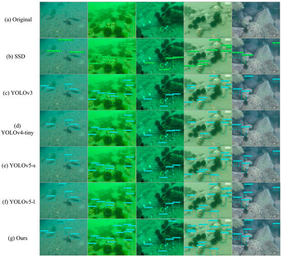 Performance of different detection methods in CURPC 2020 datasets. (a) Original Input Pictures. (b) Results of SSD. (c) Results of YOLOv3. (d) Results of YOLOv4-tiny. (e) Results of YOLOv5-s. (f) Results of YOLOv5-l. (g) Results of FA-CenterNet.