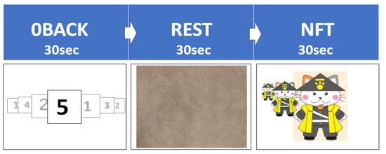We designed a visual task with three stages (Figure 2). The first: 0BACK; the second: REST; the third: NFT sequentially, without any intervals. Each stage lasted 30 s with a 5 s interval between stages. The first two stages were reference tasks, and the third stage was the principal task, NFT. Using customized software (C#, Microsoft, Redmond, DC, USA), the tasks were synchronized to regulate the EEG monitoring software by trigger signals at the beginning and the end of each stage.