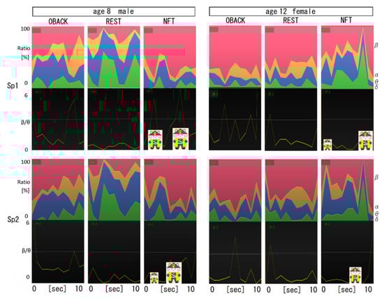 Figure 3 shows two 10-s trend examples per stage of two subjects, an 8-year-old male and a 12-year-old female. The upper panel shows the power value from the DFT results for each frequency band, delta, theta, alpha, and beta, integrated from the bottom to the top, and the lower panel shows the change in the beta/theta for each left (Sp1) or right (Sp2) forehead electrode record. Results from Sp1 and Sp2 were generally synchronized within individuals but varied by individual, age, stage, and wave bands.