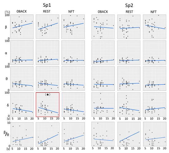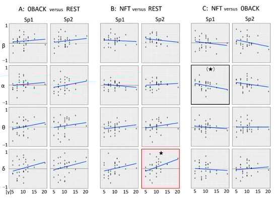 There was a trend towards an age-dependent increase in Sp1 alpha in NFT compared to 0BACK (Figure 5C: NFT versus 0BACK, enclosed by a black box, and Table 4, p = 0.085 (*)). In addition, the age-dependent linear regression lines of 0BACK versus REST (Figure 5A) showed a general trend of OBACK exceeding REST, whereas no trend was seen in fast waves, beta, and alpha, of NFT versus REST (Figure 5B).