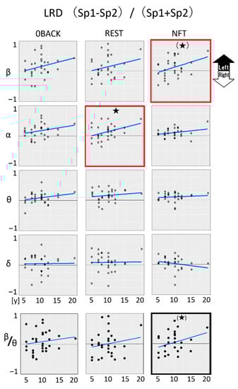 Finally, we explored the lateralization of brain functional dominance. We found an age-dependent trend toward left-brain dominance in beta waves during the NFT stage (Figure 6 beta and NFT, the graph enclosed by a red square, Table 5, p = 0.052 (*)). The NFT trigger signals, beta/theta ratios at NFT also showed a similar weak trend toward left dominance (p = 0.087 (*), enclosed by a black square in Figure 6).