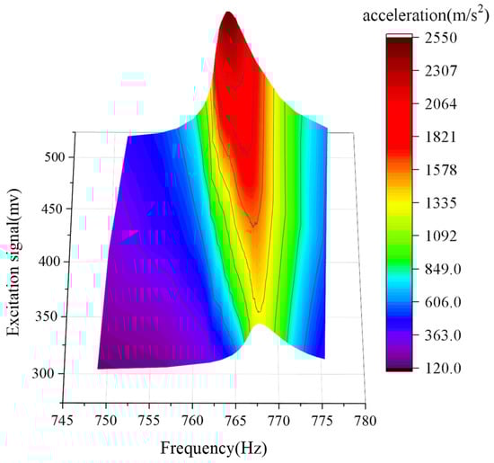 As shown in Figure 1, the resonant peak shifts in a fixed direction as the input amplitude changes. This is because the resonance frequency of the resonance mechanism changes with the change of the working acceleration. Resonance frequency change can be suppressed with the application of new materials, such as metamaterials [15,16,17]. However, under current conditions, the experimental system needs to adjust the excitation signal to ensure that the vibration is always in a high-acceleration state. Existing methods adjust the excitation amplitude at a fixed frequency. However, the amplitude of the resonant excitation at a fixed frequency above 7000 m/s2 becomes unstable and difficult to control [18]. This results in insufficient calibration capability of current vibration sensors under high acceleration.