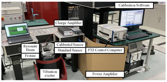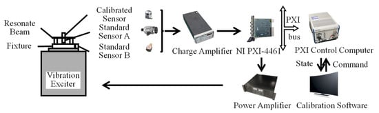In order to verify the amplitude stability of the resonance control system, an experimental setup, as shown in Figure 10, was built. Where the standard sensor was a Endevco 2270 charge sensor, and the sensor used for testing is a Endevco 7240 charge sensor. Adopt Endevco’s signal amplifiers, NI’s sound and vibration module as control device. Standard sensor A was fixed at the installation position in the center of the resonant beam and was used to measure the acceleration of the resonant beam for use as a vibration control feedback signal. The calibration sensor and standard sensor A were connected “back-to-back.” At the same time, standard sensor B was installed on the vibration device table and was used to measure the acceleration of the vibration device table, serving as an auxiliary feedback signal for the vibration control system.