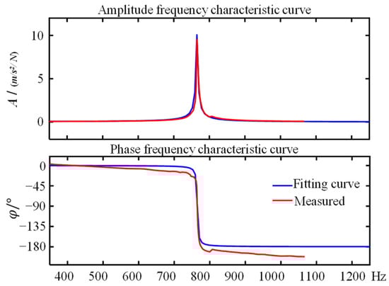 Figure 4 shows the amplitude–frequency characteristic curve and its transfer function fitting curve of a certain length under the fixed input excitation signal of the vibration exciter obtained based on the open-loop manual control test method. The acceleration transfer function fitting the experimental data is: