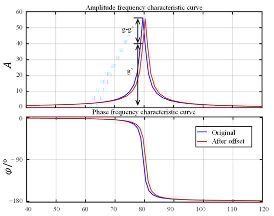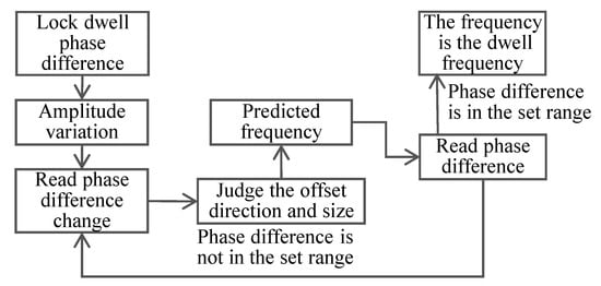 The phase–frequency curve after increasing the acceleration is shown in Figure 5. The new phase difference is calculated as , and is compared with . We control the excitation signal of the vibration device to change the frequency so that and are within the control interval. At this time, is the sensor’s new resonance frequency—the dashed line shown in Figure 5. Such repeated resonant beams will always work in a resonant state.