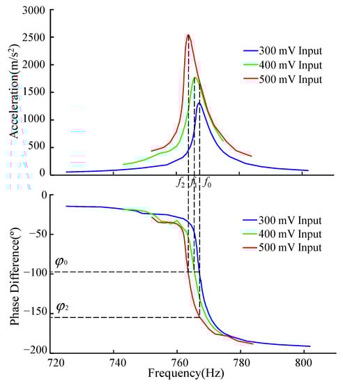 It is proved that there is a fixed relationship between the mechanical structure’s resonance peak and the input and output phase difference. It can be seen from Figure 5 that although the nonlinear change of amplitude and frequency is severe, it still maintains a consistent, continuous transition in the phase-frequency dimension. Thus, the control system can determine the frequency at which the resonance peak is located by observing the value of the phase difference [33].