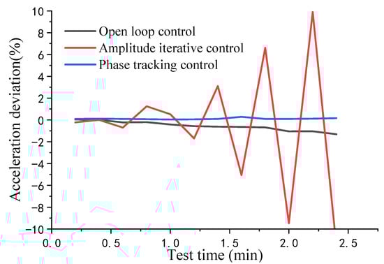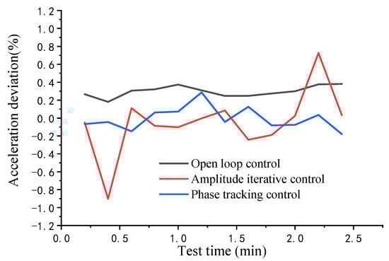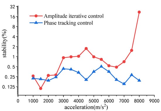 Figure 11 compares the amplitude stability with different control methods under amplitudes of 1000–8000 m/s2. It can be seen that when the acceleration is lower than 7000 m/s2, the amplitude stability of experiments is less than 2% for both methods. When the acceleration is greater than 7000 m/s2, the output amplitude of the vibration system using amplitude iterative control will oscillate continuously. The large and small amplitudes cause the acceleration stability to increase significantly. Furthermore, the stability under phase tracking control is less than 0.5%.