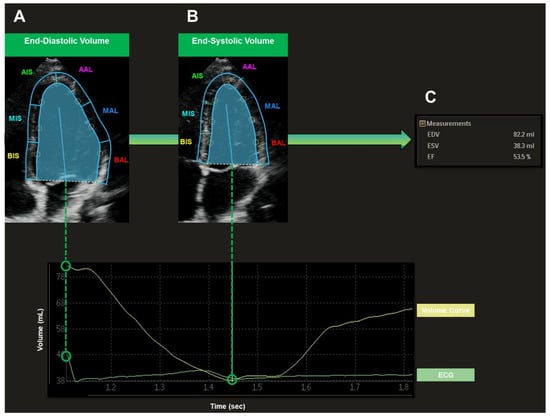 Semiautomatic Assessment of Left Ventricular Volumes Recorded in Apical Four-Chamber View. End-diastole (A) (R wave in ECG) and end-systole (B) (end of T wave in ECG) were set automatically by the software. The LV endocardium was marked precisely by the investigator in end-diastole (A) and end-systole (B). The following parameters were then acquired semiautomatically by the software (C): EDV, end-diastolic volume; ESV, end-systolic volume; SV, stroke volume; EF, ejection fraction.