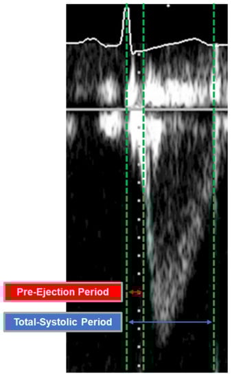 Assessment of the Pre-Ejection and the Total-Systolic Period of the Left Ventricular Outflow Tract. A pulsed wave Doppler was positioned over the aortic valve in apical five-chamber view.