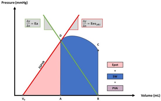 The pressure–volume area (PVA, mmHg × mL) embodies the total LV mechanical energy generated during one single cardiac cycle and was defined as [,,]