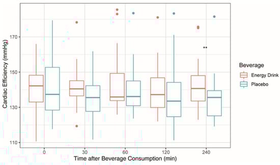The lower CE might be partially explained by the high caffeine amounts contained in EDs. Caffeine is vasoconstrictive and thus leads to an increase in blood pressure []. In a similar pediatric cohort, our department revealed a significantly higher SBP, DBP and arterial stiffness after acute ED consumption [,]. An elevation in blood pressure and thus LV afterload is associated with an increase in Epot, SW and ultimately PVA to maintain SV and EF. In this study, PVA increased more profoundly after the ED consumption compared to after placebo consumption but did not reach statistical significance.