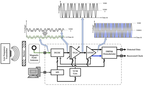 In the proposed architecture, an external magnetic field antenna receives the transmitted analog BPSK signal from a low-frequency (LF) TX as stated in Figure 1. Depending on the distance and the barriers between the LF TX and the antenna, the attenuation of the transmitted analog BPSK signal cannot be constant. In other words, the amplitude of the received signal at the antenna is variable. Therefore, a reconfigurable gain amplifier is required to provide a dynamic range of amplification of the input signal from low to high voltage levels.