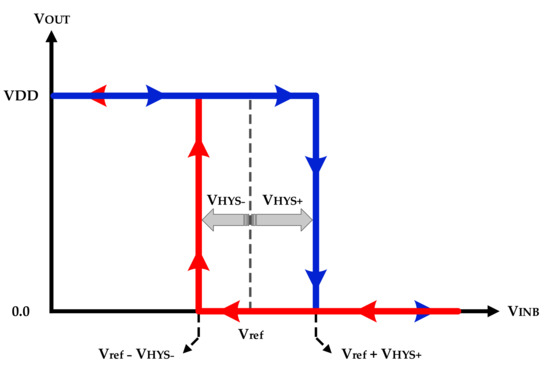 Comparators are basic circuits to convert an analog signal to its digital format. To switch the output of a comparator from 0 to VDD and vice versa, a hysteresis comparator offers the possibility of having different down () and up () threshold voltages. The loop characteristics of an inverting comparator are illustrated in Figure 2.