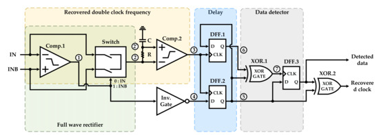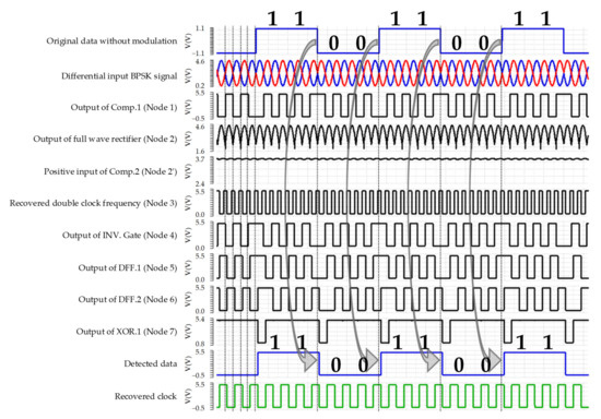 The structure of the proposed DBPSK demodulator is illustrated in Figure 4. Two hysteresis comparators, three dynamic flip-flips (DFFs), two XOR gates, and an inverter gate are formed as the building blocks of the proposed DBPSK demodulator to detect the data and recover the clock. Figure 5 depicts the simulation results of the proposed DBPSK demodulator. To detect the data and recover the clock, a double clock frequency from the differential BPSK signal is recovered by employing a full wave rectifier and a comparator (Comp.2).