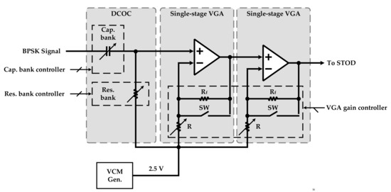 The DCOC circuit is located at the interface of the AFE to regulate the DC voltage level of the received analog BPSK signal to the desirable VCM of 2.5 V, which is generated by the conventional VCM Gen. As indicated in Figure 6, the DCOC Cap. bank (10–90 pF) blocks the DC level voltage of the input signal and adjusts the DC level voltage to 2.5 V through the DCOC Res. Bank (1–3.3 MΩ).