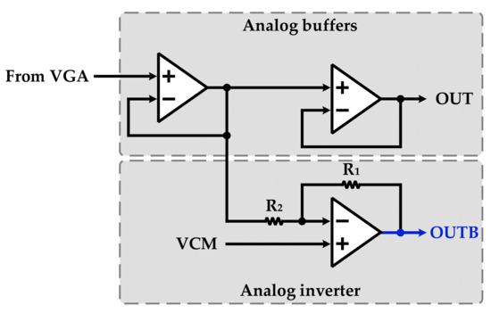 Two single-stage VGAs are implemented to construct the cascaded VGA block as depicted in Figure 6. The provided power gain of a single-stage VGA by using and R in the feedback is given by the following expression: