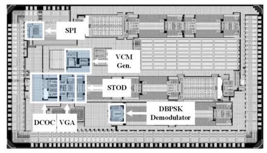The top layout of the chip and location of AFE, DBPSK demodulator, SPI, and VCM Gen.
