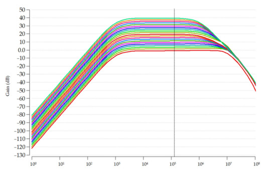 Figure 10 indicates the post-layout simulation results of the gain performance throughout the AFE, which is provided by the cascaded VGA. AFE can offer a wide range of power gain from 0 dB to 40 dB with 2 dB resolution.