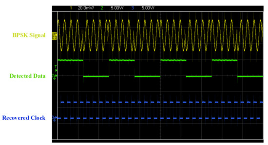 Figure 11 illustrates the measurement results of the detected data and recovered clock with 50% duty cycle. The measurement results show the received BPSK signal is successfully amplified by AFE and demodulated through the proposed DBPSK demodulator.