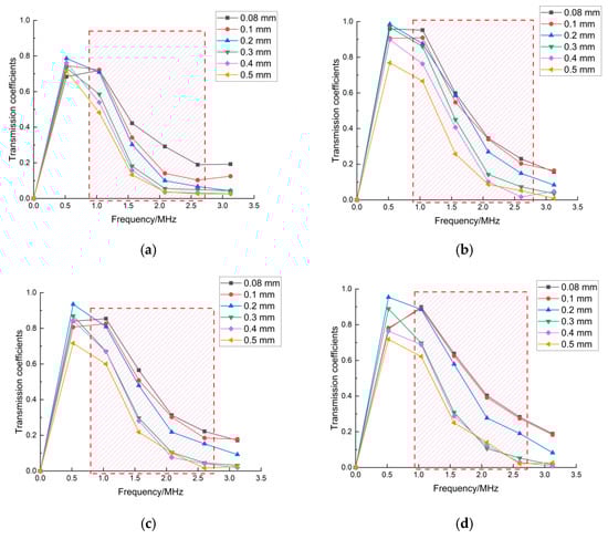 Figure 6 represents the changes of the transmitted wave in the frequency domain when the parameters of the FEM model were changed. Comparing Figure 6a with Figure 6b, and Figure 6c with Figure 6d, it is obvious that the amplitude of the transmitted signal in Figure 6b was larger than that in Figure 6a and the amplitude of the transmitted signal in Figure 6d was also larger than that in Figure 6c. The reason for this phenomenon is that the stronger laser source releases more energy into the material, leading to a bigger amplitude of transmitted waves being generated. The increase in pulse time and power of the laser source converts the higher energy of the incident laser into the mechanical energy of acoustic waves. Moreover, the bandwidths of transmitted frequency also increased, as shown in Figure 6b,d, with the increase in pulse time and power of the laser source. The amplitude of all frequency components was enhanced by the stronger acoustic wave generated by the laser, leading to the frequency bandwidth being wider, and after that the weak-amplitude component, which did not affect the bandwidth, was enhanced. In contrast, the radius of the laser source increased, whereas the other excitation conditions of the liner laser were unchanged, and the lesser energy of the laser in the unit area was irradiated into the material, resulting in the amplitude of the transmitted waves decreasing. On account of the decrease in energy of the acoustic waves generated by a laser source, the frequency bandwidth of transmitted waves was narrower with increasing radius of the laser source. The frequency spectrum of transmitted waves is shown in Figure 6e,f. Furthermore, the transmission coefficients under these excitation conditions were calculated by Equation (2) and are shown in Figure 7.