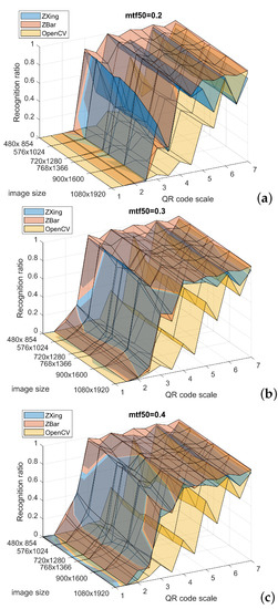 - For the scale ≥ 3.5 ZBar reaches about 0.9, ZXing offers similar but slightly worse performance at such scales; it can be especially observed for lower MTF50 = 0.2.