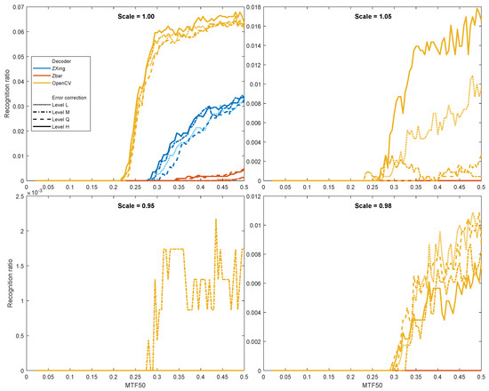 - Results using various error correction codes are a bit ambiguous. Below Nyquist, only OpenCV is still able to decode little information; the deeper below the Nyquist limit, the lower the results we obtain. A noteworthy fact is that lower levels (L and M) offered the best performance at scale = 0.98, and the Q level was the only case resulting in a few non-zero for scale = 0.95.