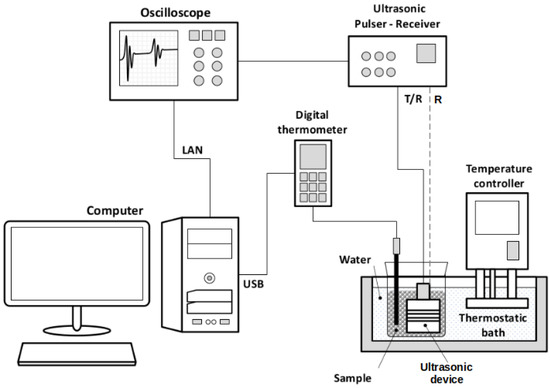Figure 2 shows the experimental setup used for the acquisition of the ultrasonic signals. The measurements were made in a thermostatic bath with an accuracy of 0.1 °C (Huber CC-205B, Offenburg, BW, Germany). The transducer was driven in a transmission–reception device or pulse-echo modes using an ultrasonic pulser/receiver (Olympus Panametrics 5077-PR, Waltham, MA, USA). The digital oscilloscope (Agilent Technologies 5042, Santa Clara, CA, USA) was used to digitize the ultrasonic signals. The sample temperature was measured using a digital thermometer (DeltaOHM HD2107.2, Caselle di Selvazzano, PD, Italy). Both the oscilloscope and the digital thermometer were connected to a desktop computer, allowing the simultaneous acquisition and storage of the ultrasonic signals and temperatures.