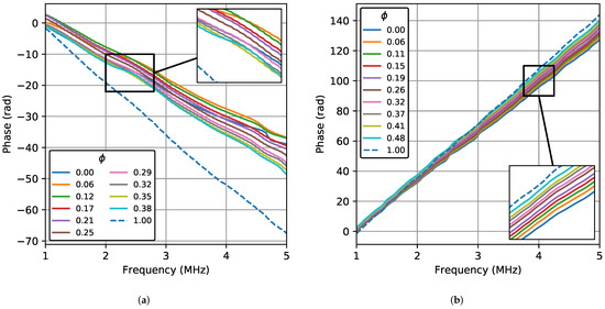Figure 3 shows the phase () as a function of the frequency of the signal obtained with the TRD and BSD in the 1–5 MHz frequency band for all the water concentrations. The presented results are the average of 30 acquisitions. In the TRD, the phase behavior is almost linear with decreasing values that lead to a negative slope. Although some curves overlap, a different slope is observed at each concentration. In the BSD, the linear behavior is more evident, with non-overlapping curves and increasing values leading to a positive slope. The sign of the slope can be negative or positive depending on the signal delay and the time window used. The delays due to the change in the propagation velocity are small, so the slope value varies within a narrow range. Figure 3 shows only the results for 20 °C because the behavior is identical for the other temperatures in both TRD and BSD. Just small differences in phase slopes were observed because the tests were performed at different temperatures.