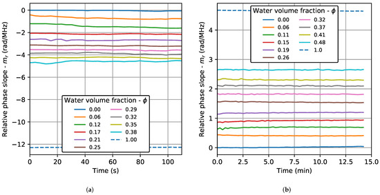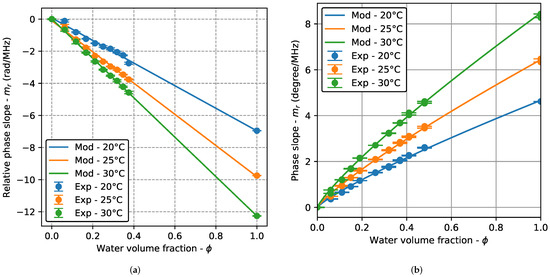 The percentage of relative errors reported in a previous work [17], where the propagation velocity was used as the measurement parameter, was up to 46%. However, these high error values were observed in the entire range of measured volume fractions (), being a consequence of the higher dispersion of the propagation velocity results. Therefore, the methodology based on the phase slope provides better results than one based on the propagation velocity calculated in the time domain.