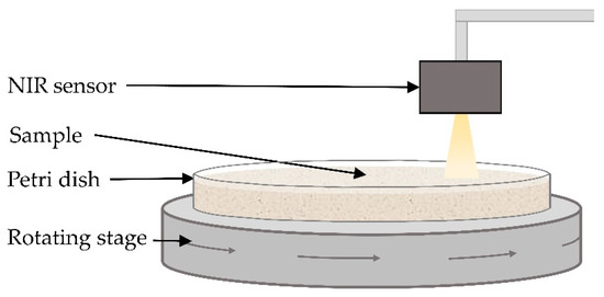 All materials were measured using two NIR sensors: NIRONE S2.0 (wavelength range: 1550 to 1950 nm, 1 nm resolution) and S2.5 (wavelength range: 2000 to 2450 nm, 1 nm resolution) (Spectral Engines, Oulu, Finland). Before acquisition of each spectrum, a white reference spectrum at 90% light intensity and a dark background spectrum at zero light intensity were collected. The distance between the NIR sensors and the sample surface was maintained at 2 cm for all measurements. Samples weighing approximately 100 g were placed in a 12 cm-diameter glass petri dish and compressed to obtain a flat surface (Figure 1). The samples were measured under static and motion conditions at three speeds: 0.017, 0.036, and 0.068 ms−1 (designated as slow, medium, and fast throughout, respectively). For the static measurements, between each spectrum acquisition, the petri dish was rotated so that spectra were collected from all areas of the sample. For the measurements under motion conditions, the petri dishes were placed on a rotational sample holder that had variable speed settings. Five samples were measured from each material and ten spectra were acquired from each sample, producing a total of 50 spectra for each material and for each sensor. For the materials sourced from three brands (see Table 1), 3 × 50 spectra for each material and each sensor were collected. Therefore, in total, 1250 spectra were collected using each sensor at each speed (stationary, slow, medium, and fast).