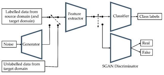 A diagram of the semisupervised generative adversarial network (SGAN) structure and training procedure. The network was trained in three steps, iteratively: (1) the feature extractor and discriminator were trained to classify that the labelled data were real, (2) the feature extractor and discriminator were trained to classify that the generated samples were fake and the generator was trained to confuse the discriminator, (3) the feature extractor and discriminator were trained to classify that the unlabelled target domain data were real.