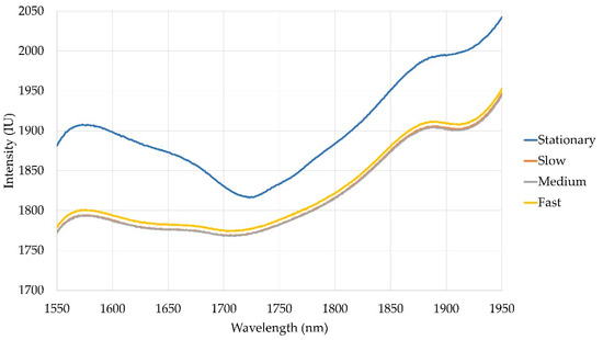 Plots of the average spectra for barley flour under stationary and each moving condition (slow—0.017 ms−1, medium—0.036 ms−1, fast—0.068 ms−1).
