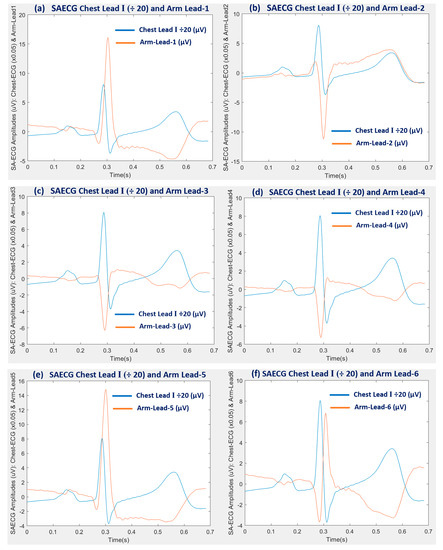In a different perspective, from a more recent pilot study investigation using a small dataset (N = 11), with similar objective of finding the best upper-arm bipolar lead axis orientation was investigated without using the gold standard ECG signal averaging denoising method [16]. There, under such rudimentary signal pre-conditioning, the bipolar lead, defined as Ch8 − Ch10, was found to be the lead with the highest SNR mean value, with a corresponding axis angle orientation defined as −30°. In contrast, here, an arm-ECG signal averaging approach using a beat alignment technique referred to the Chest Lead-I, further investigated the proposed objective on discovering arm-ECG QRS events. Thus, the best results of arm-Lead mean SNR of QRS complexes obtained in this extended study; after performing ECG signal-averaging denoising, were significantly improved here: from 15.8 [16] to 244 (Table 3). Additionally, arm-ECG P- wave and T- wave signals discoveries were enabled by the effective SAECG denoising technique in this extended study using an SAECG denoising technique. This study, with a larger database of 30 subjects confirms that the bipolar lead Ch8 − Ch10, labelled here as Lead-1, and Lead-5 (axis angle at −30°) were found to be the best two bipolar leads for QRS detection, thus, corroborating the results obtained in the previous pilot study, with optimal adjacent axis angles findings presented here.