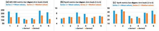 Bar charts presentation with amplified scale ranges (zoom-in) to facilitate depicting performance differentiation between the six arm leads mean and median value results (on the 30 subject cases) in Table 3: (a) for QRS SNR metric values, (b) for PqrsR (%) metric values and (c) for TqrsR (%) metric values.