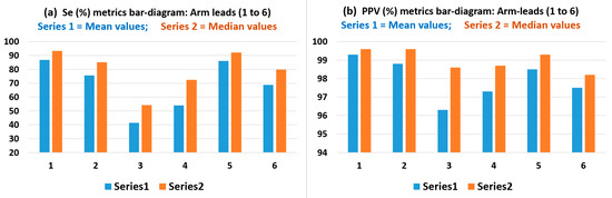 Table 4 and bar charts in Figure 5 present result values obtained for the sensitivity (Se%) performance metric; which indicates the true positive rate, and for the positive predictive value (PPV%) performance metric, which indicates the QRS detection precision. The mean, SD, median and IQR results in Table 4 can reveal the QRS detection performance of the six arm-leads, based on the Pan-Tompkins approach described in Section 2.4.4. It can be observed that, consistently with the results in Table 3, arm Lead-1 (axis at 0°), arm Lead-2 (axis at 30°) and arm Lead-5 (axis at −30°) resulted with the highest Se% metric median values: 93.3%, 85.1% and 92.2%, respectively, and also these three arm leads presented the highest median values for detection precision, PPV (%): 99.6%, 99.6% and 99.3%, respectively. Once again, it is interesting to note that these axes are angularly adjacent around the 0° axis (coplanar to chest plane) and corroborate the arm leads QRS events clique of arm leads.