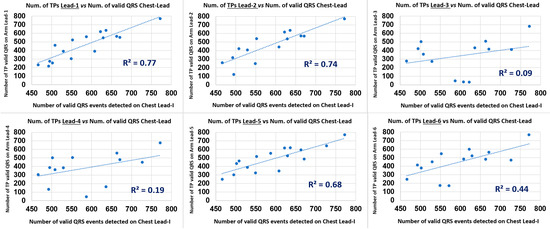 As an intuitive and ease of clear interpretation analysis on the arm leads QRS detection performance in study branch-2, the simple evaluation of the Pearson correlation coefficient (p) [28] between the total Number of arm-Lead TP events (valid arm ECG QRS events as annotated by the Chest Lead I, in the 8 min ECG recording, NTPqrs) and the total number of Chest Lead I detected Valid QRS events (NVChestQRS), according to the PT algorithm, and it’s set of QRS event time and amplitude thresholding parameters, for reliable event validation, as conveniently presented graphically as a bar chart in Figure 6 for the 18 subject cases data points, and in a scatter plot for each of the six arm leads; as presented in Figure 7. Both the p value and the R2 value results for this complementary analysis are summarised in Table 5.
