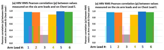The HRV metrics results are presented in Table 6, in Figure 8 bar charts and in Figure 9 scatter plots. From the results summarised in Table 6 and Figure 8 on this particular QRS event detection assessment for measuring HRV RMS metric, on 8 min ECGs from the six defined bipolar arm leads in this 3rd-branch of study, which correlates the HRV RMS metric measured conventionally from the Chest Lead I ECG, with the simultaneously recorded arm-ECG leads, in the same subject case, as described in the Methods Section 2.4.5.
