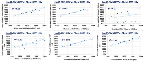 In this 3rd-branch of study, arm Lead-1, Lead-2, Lead-5 and Lead-6 presented distinctively the highest correlation figures for the HRV RMS metric against the gold standard values measured in the Chest-Lead, both in p and R2 coefficients values: p = 0.97 and R2 = 0.95, p = 0.96 and R2 = 0.93, p = 0.99 and R2 = 0.98, p = 0.97 and R2 = 0.93, respectively, as can be appreciated from Table 6. In contrast, arm Lead-3 and Lead-4 consistently presented the lowest HRV RMS correlation with Chest RMS values: p = 0.26 and R2 = 0.07, p = 0.89 and R2 = 0.80, respectively. Thus, these results are in agreement with the indications from the other study branches on best arm leads on QRS events discovery tendencies.