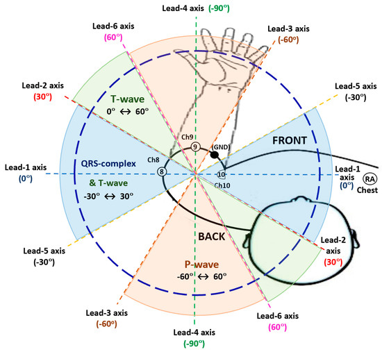 According to the favourable tendency revealed by three adjacent arm leads: Lead-1, Lead-2 and Lead-5 in this study, QRS complexes are best discovered on the arm-ECG when the arm-lead radial axis orientation is in the angular fan from −30° to 30°, including the 0° axis (refer to Figure 10). ECG P-wave signals are best discovered on the arm when the arm-lead axis is within the angular fan from −60° to 60° (equivalent to −120°), including the −90° axis, as relatively enhanced results are observed with adjacent arm Leads 3, 4 and 6. Finally, as ECG T-wave event signals were best discovered with four adjacent arm leads: Lead-1, Lead-2, Lead-5 and Lead-6, this revealed that the axis angle ranging from −30° to 60° would be the axis angular fan for favourable arm-ECG T-wave discovery. All these results remarks are summarised in Figure 10.