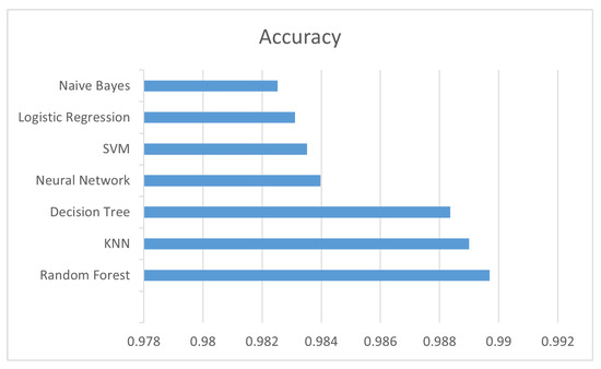 For the classification of records using machine learning, the following algorithms were evaluated: Logistic Regression [34,35]; Naive Bayes [35,36]; Decision Tree [37]; Random Forest [35]; KNN (K Nearest Neighbor) [35,38]; SVM (Support Vector Machine) [39,40]; Neural Network [35].