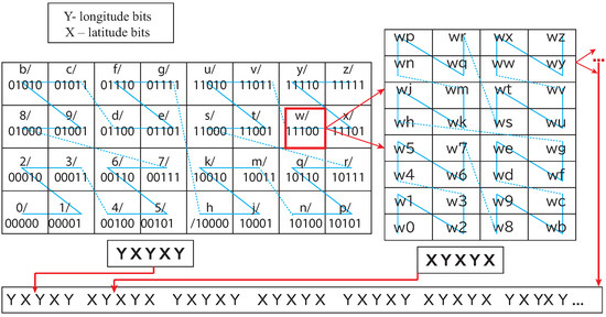 In our proposed model, Geohash was introduced to represent the geographical locations, which is a sequence of characters consisting of English letters except “a”, “i”, “l”, “o”, and digits 0–9 at every level of the representation. The string length corresponds to the size of the geographical area designated by the Geohash, as shown in Table 1. It is a hierarchical spatial data structure subdividing the space into smaller subspaces depending on the Geohash length. For example, the first character divides the space into 4 × 8 (four rows and eight columns), and the division of regions alternates between 8 × 4 and 4 × 8 ([20,21]). A space-filling curve decides the sequence number of the areas. When alternate characters’ binary representations are combined in Geohash, two strings for determining row X (latitude bits) and column Y (longitude bits) cross bit by bit, see Figure 1.