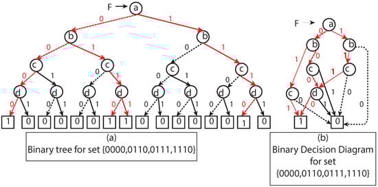 Due to the evolution of decision diagrams over the years, BDDs have many variants such as ROBDD, ZDD (zero suppressed decision diagram) [25], SBDD (shared binary decision diagram) [26], MTBDD (multi-terminal binary decision diagram) [27], and many more. In the present study, ROBDD was introduced as well as BDD. For simplicity, ROBDD is abbreviated as BDD in the following sections.