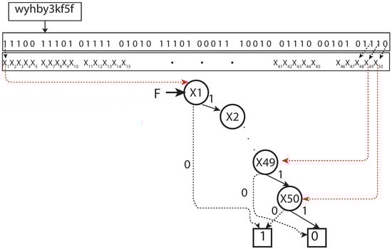- BDD representation of a unit Geohash: A Geohash is a unique symbolic representation of all the points available within the given area on the earth. For each character in Geohash, 32 values (English letters except “a”, “i”, “l”, “o”, and decimal system digits 0–9) are possible to use, and, therefore, in our model, five Boolean variables () were applied correspondingly (Figure 1). Consequently, five nodes in a BDD were used to represent the corresponding Boolean variables for a binary representation of a given character in a Geohash. For a given Geohash, each character had five corresponding nodes in the BDD. For a Geohash of 10 characters/levels, 50 nodes were needed for corresponding bits, plus two extra nodes representing zero (false) and one (true) leaf node in a BDD. (for experiments, the vehicle was assumed to be within a Geohash, having a distance of 4872 m (north to south) and 3955 m (east to west); hence, a five-level BDD with 25 nodes served the purpose), i.e., the first five levels of Geohash did not change in our setting. Every corresponding node, low or high, has its values depending on the Boolean function represented. Therefore, to represent a single Geohash using BDD corresponding binary string ends at one (1) node of a BDD, and all other binary strings end in zero (0) (Figure 3).