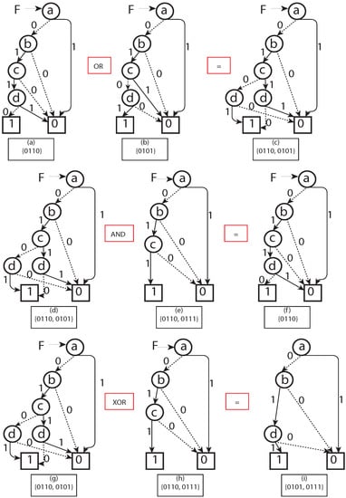 Figure 4. (a–c) BDD OR operation is equivalent to set union operation. (d–f) BDD AND operation is equivalent to set intersection operation. (g–i) BDD XOR operation is equivalent to a set symmetric difference operation.
