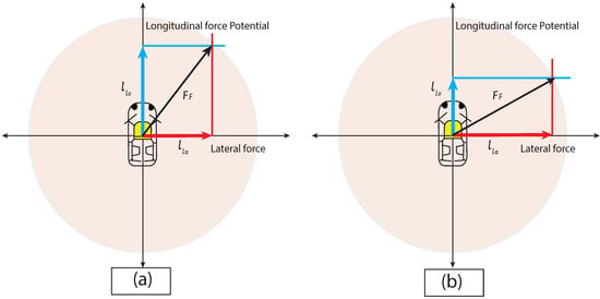 Kamm’s circle was introduced as an abstraction [29] for the reachable positions of a given car. Kamm’s circle as abstraction overapproximates the locations to estimate vehicle positions that may be reached in a closed distance. Kamm’s/traction circle limits the maximum forces applicable between tires and the road. In the model, longitudinal and lateral acceleration satisfies Equations 4 and 5 without losing the grip (Figure 7).