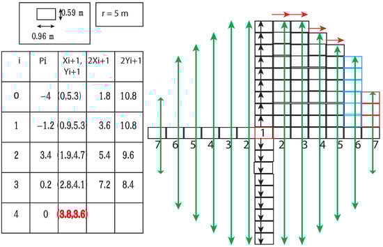 The modified mid-point circle generation Algorithm 2 generated the BDD of all the Geohashes in the circle of radius r(Figure 9). Step I is the initialization step. In Step II, the BDD for all the Geohashes with black arrows were generated as shown in Figure 9 and merged with the BDD (circle_BDD) to represent all Geohashes within the circle by using or operation, as the or operation on BDD is the equivalent set union operation. Then, in Step III, the algorithm initialized the decision parameter p with . Step IV, depending on the value of p, generated successive Geohashes available in the boundary of the first quadrant (along red arrows); successive p values and more parameters of the circle were as follows: