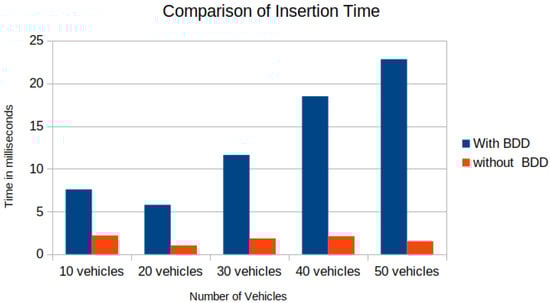 In the experimental setup, Figure 13a shows the union of reachable Geohashes for the Kamm’s circle/reach sets at the time and s for the vehicle with ID = 1; Figure 13b shows the union of enclosing Geohashes at the time and s. In the experimental setup, the BDD was provided to represent the future occupancy for a given vehicle as for Scenario 2, and we stored the data in the PostgreSQL database-based LDM in JSON format. Then, the time needed to store the vehicles layer 4 information was compared between vehicle ID, vehicle type, velocity along x-axis, velocity along y-axis, longitude, latitude, lanelet id, and current time and vehicle ID, vehicle type, velocity along x-axis, velocity along y-axis, longitude, latitude, lanelet id, (in JSON format), and current time. An increase in insertion time was observed when considering the BDD information as can be seen in Figure 14. Insertion time increases because the amount of data fed into the LDM increased due to the BDD. Although there was an increase in insertion time, our computer experiment demonstrated that our formulation for LDM implementation could store much richer spatial information, and even with 50 vehicles, data insertion took around 25 ms with , which is suitable for the real-time operation [37]. As shown in Figure 13c, the BDD-based future occupancy information was utilized for the collision avoidance task. Figure 15 and Figure 16 indicate the timings for the following tasks: