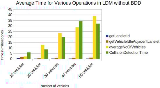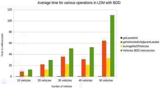 An increase in time for tasks was observed, such as Task2 and Task4, by introducing BDD in the LDM, as seen in Figure 15, compared to Shimada et al. [6] implementation in Figure 16. Although an increase in computation time, the proposed framework enabled the storage of possible future locations in the LDM, which is lacking in previous implementations of the LDM. Future occupation information is crucial compared to the vehicle’s current location because vehicles in middle- and long-distance ranges may interact in the future. In the current version of the implementation, nearby present vehicles may not interact in some cases. In this sense, the accuracy of collision detection has to be verified in algebraic operations over BDDs, especially around the borders of Geohash spatial segments. For up to 40 vehicles, the functions performed took less than 100 ms (Figure 15), which is applicable for real-time operation.
