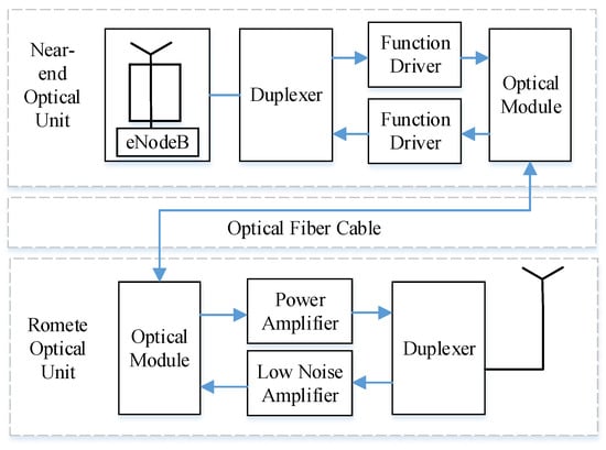 Over the last few decades, consumer groups demand increasingly high requirements for the quality of network usage. Blind areas and weak signal areas still exist in the deployment of the fourth-generation communication network. LTE networks are facing challenges such as providing greater system capacity and wider cell coverage in a cost-effective manner. The installation of additional base stations is complex and expensive, and the corresponding rate of return is low. In contrast, using a digital optical fiber repeater (DOFR) is flexible, simple, and cheap, thereby providing an economical and efficient solution for the network coverage by network operators. The DOFR is a kind of relay device that can enhance the wireless signal, thereby achieving signal enhancement in areas with weak signal coverage. The structure of the DOFR mainly includes the near-end optical unit, the remote optical unit, and the optical fiber cable, as shown in Figure 1.