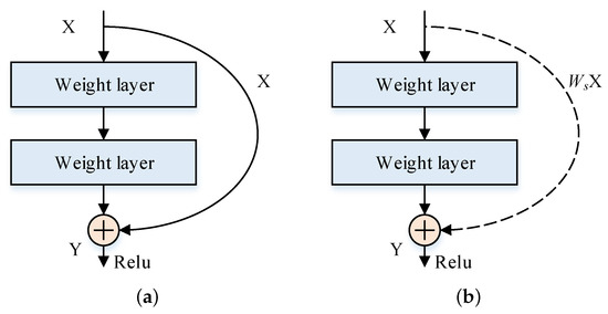Two modes of shortcut connection. (a) Input and output channels are same. (b) Input and output channels are different.